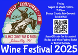 Come join us at the Blanco County Fair & Rodeo for a day filled with fun, wine, and rodeo action! Sip on wines from Texas Wine Collective and other local wineries while enjoying rodeo performances. Don't miss out on this unique and fun event that combines the best of both worlds - wine and rodeo!