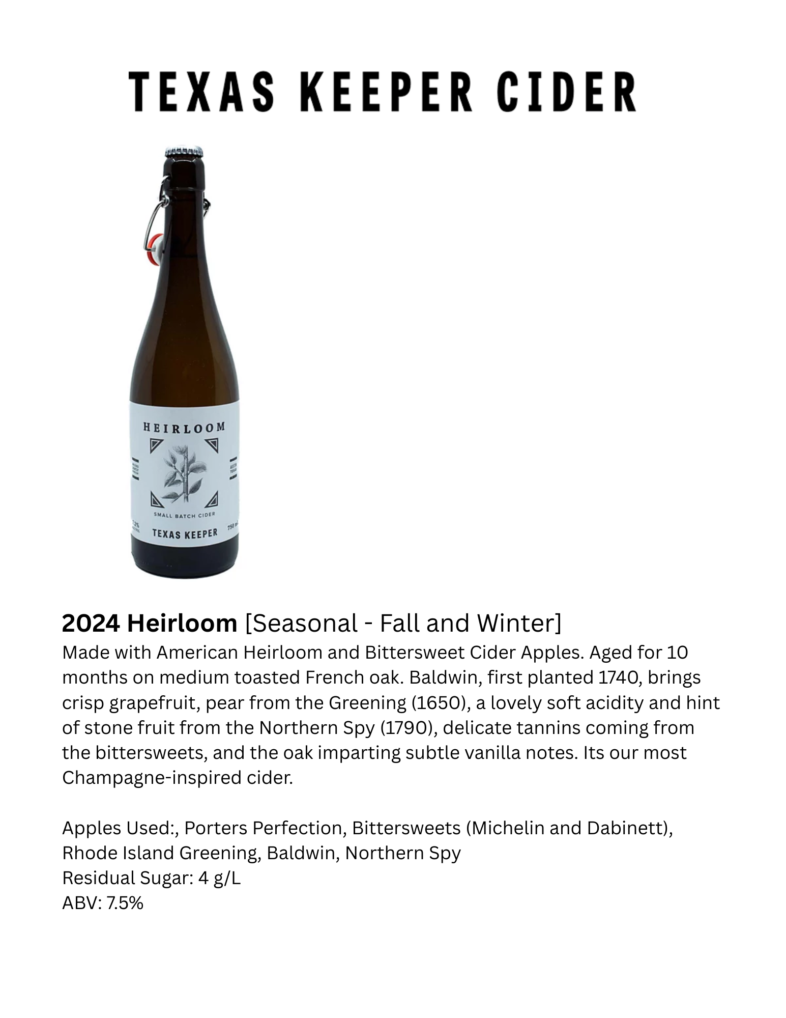 Made with American Heirloom and Bittersweet Cider Apples. Aged for 10 months on medium toasted French oak. Baldwin, first planted in 1740, brings crisp grapefruit, pear from the Greening (1650), a lovely soft acidity and hint of stone fruit from the Northern Spy (1790), delicate tannins coming from the Bittersweets, and the oak imparting subtle vanilla notes. It's our most Chapagne-inspired cider.