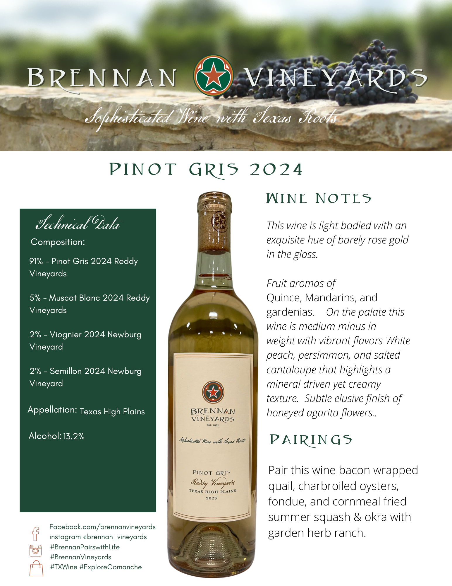 This Pinot Gris is vibrant and full of zest! Fruit aromas with notes of persimmon and hints of honeysuckle blossoms. Bright acidity with a lush and velvety mouthfeel, with flavors of white peach, persimmon, and salted cantaloupe.